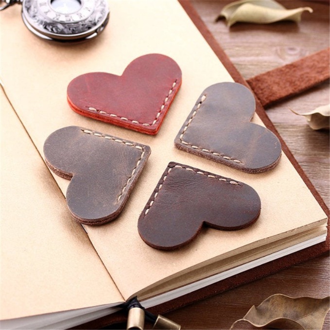 - 4 pieces of leather heart bookmarks, 1 pieces in brown, 1 piece in black 1 piece in red and 1 piece in navy blue